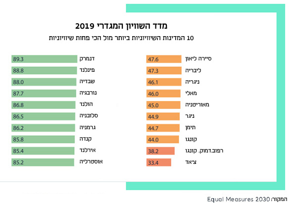 בכל זאת, בראש הרשימה עומדת דנמרק שהוכתרה למתקדמת ביותר בעולם מבחינת שוויון מגדרי לאחר שקיבלה ציון של 89.3. שאר העשירייה מורכבת מפינלנד, שבדיה, נורבדיה, הולנד, סלובניה, גרמניה, קנדה, אירלנד ואוסטרליה.