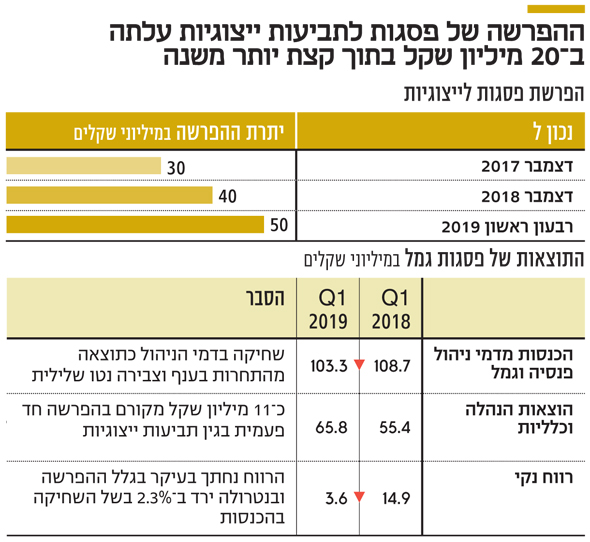 ההכנסות של פסגות מקופות גמל ופנסיה עמדו ברבעון על 102.3 מיליון שקל, כמעט 6% פחות מברבעון המקביל, בדיוק מהסיבות האלה. עם זאת, הנפילה החדה ברווח מוסברת בזינוק בהוצאות הנהלה וכלליות שעמדו ברבעון על 68.5 מיליון שקל — 24% יותר מברבעון המקביל אשתקד ובסכום אבסולוטי — 13.1 מיליון שקל יותר.