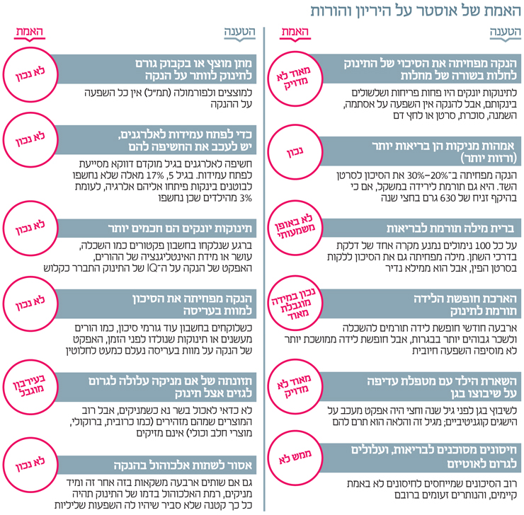 "אם מסתכלים על הנתונים רואים כמה תועלות שנובעות מהנקה, כמו פחות שלשולים ופריחות לתינוק ופחות סרטן שד לאמהות", מסכמת אוסטר. "מנגד, חלק מהטענות על הנקה לא נתמכות בנתונים טובים, ובהן: שהיא מעלה את ה־IQ, מפחיתה השמנה או תורמת לבריאות הילד בהמשך חייו. חלק מהטענות על התועלות לטווח הארוך גרנדיוזיות, ולא נתמכות בנתונים".