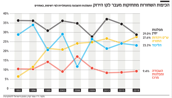 ויש סיבות נוספות: העלייה של המפלגות החרדיות מעבר לקו הירוק באה על חשבון הליכוד ומפלגות הימין. זאת, לא בהכרח משום שהתמיכה בהן בהתנחלויות פוחתת. פשוט, בגלל תוספת המתנחלים החרדים, שיעור המתנחלים הלא־חרדים הולך וקטן. כך הליכוד ירד מ־29% בבחירות של 1992 ל־23% בבבחירות באפריל השנה. שאר מפלגות הימין ירדו באותה תקופה מ־36% ל־29%.