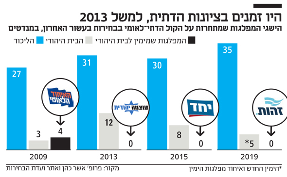עד עליית הימין לראשונה לשלטון ב־1977 יוצגה הציונות הדתית על ידי מפלגה אחת, המפד"ל, שתפקידה הראשי היה לדאוג לאינטרס המגזרי. מאז שהימין נמצא בשלטון המצביעים הסרוגים מרגישים הרבה יותר נוח לפצל את קולם. לדברי כהן, בכל מערכת בחירות יש מפלגה שמתחרה בבית היהודי (ולפניה במפד"ל) מימין. באפריל האחרון זו היתה זהות. ב־2015 יחד של אלי ישי ועוצמה יהודית. בעבר הרחוק יותר זו היתה האיחוד הלאומי. הפעם זו עוצמה יהודית לבדה. כהן אומר שלפחות מנדט של עוצמה יהודית מורכב ממילא דתיים לאומיים. השאלה היא האם יהיו מספיק מצביעים סרוגים נוספים כדי להעביר את מפלגת ממשיכי כהנא את אחוז החסימה.
