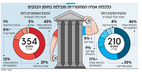 השיעור הגבוה ביותר של בנקים חזקים נמצא בכלכלות המתעוררות של אסיה ובצפון אמריקה, ואילו הנתח הגדול ביותר של בנקים המוגדרים "מאותגרים", נמצא במערב אירופה ובמדינות אסיה המפותחות.