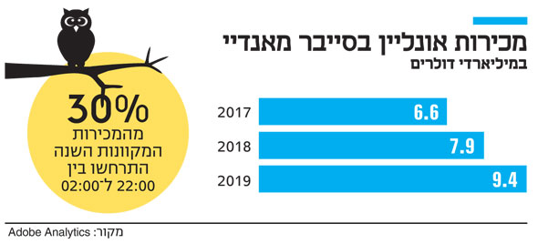 צרכני אירוע המכירות המקוון הוציאו השנה סכום שיא של 9.4 מיליארד דולר, זינוק של 19.7% לעומת השנה שעברה; בין עשר בלילה עד שתיים לפנות בוקר הוציאו הגולשים כשליש מהסכום האמור - 2.9 מיליארד דולר