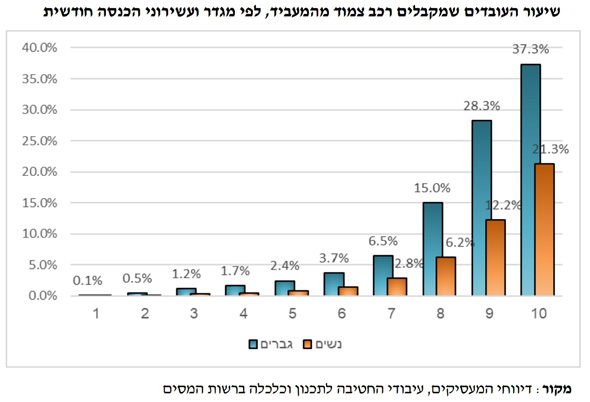 כך למשל, בעשירון השביעי (הכנסה חודשית של כ-18 אלף שקל למשק בית), 6.5% מהגברים מקבלים רכב צמוד לעומת 2.8% מהנשים; בעשירון השמיני (הכנסה של 22 אלף שקל למשק בית) קופץ הפער ל-15% מהגברים לעומת 6.2% מהנשים; בעשירון התשיעי (27 אלף שקל) ל-28.3% מהגברים לעומת 12.2% מהנשים; ובעשירי (42 אלף שקל) הוא מצטמצם במעט ל-37.3% מהגברים לעומת 21.3% מהנשים.