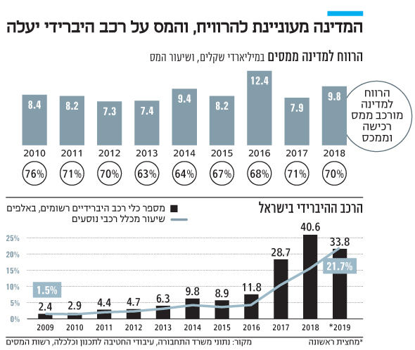 כך או כך, המדינה ממשיכה לעשות כסף מהפקקים: ב-2018 גדל מספר המכוניות שיובאו לישראל ב-22.4%, ל-267 אלף מכוניות, והכנסות המדינה ממסי קניה, מע"מ ומכס עליהן גדלו ב-20%, ל-11 מיליארד שקל. שווי המסים הממוצע שהוטל על מכונית עמד על 37 אלף שקל.
