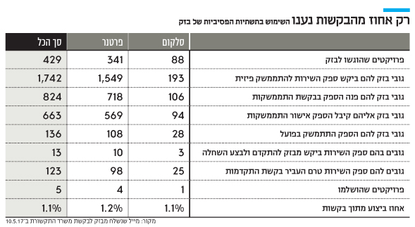 אלא שדיבורים לחוד ומעשים לחוד. בתחילת אפריל 2017 פנתה רכזת הטכנולוגיות במשרד התקשורת ילנה בסקיס אל בזק וכתבה: "אני מבינה שלאחרונה פרטנר החלה לפרוס על גבי התשתיות הפסיביות של בזק". היא ביקשה לקבל דו"ח מצב על השימוש במה שנקרא "תיק השירות", הן לגבי פרטנר והן לגבי סלקום. כלומר לדעת מה ההיקפים והמיקומים של הפריסה. באמצע חודש מאי 2017 נשלחו הנתונים מאגף הרגולציה של בזק (ראו טבלה). הם העידו שעל אף שחלפו כמעט שנתיים וחצי מאז נקבע כי בזק תיתן למתחרות גישה לתשתיות שלה, רק 1% בלבד מהפרויקטים שביקשו סלקום ופרטנר לבצע - הושלמו. כך, באותה נקודת זמן מתוך 429 בקשות הושלמו 5 פרויקטים בלבד.