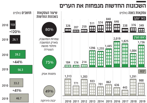 הערים בישראל שצמחו באופן המשמעותי ביותר בעשור האחרון הן דווקא ערים קטנות יחסית, שמונות פחות מ־50 אלף תושבים, אך בשוליהן נבנו שכונות ענק, תל אביב נהפכה גם לעיר של משפחות צעירות, ההעדפה של זוגות צעירים היא לרכוש דירות חדשות והפקקים והמשבר התחבורתי אינם שיקול לקניית דירה. אלה חלק מהמסקנות העולות מבדיקה של אתר מדלן עבור "כלכליסט" לסיכום המגמות בשוק הדיור בעשור שבין 2010־2019.