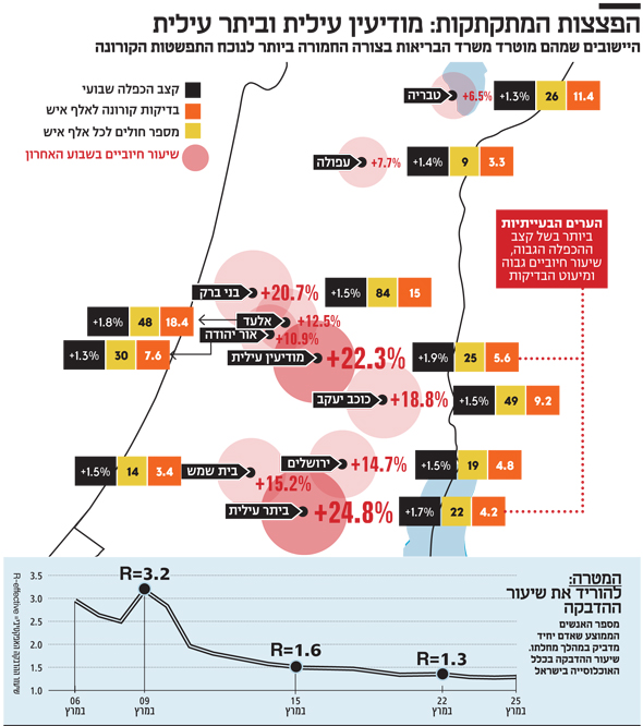 במרכז המידע מסבירים כי מודיעין עילית וביתר עילית הן הערים הבעייתיות ביותר "שכן קצב ההכפלה השבועי ושיעור הנבדקים החיוביים גבוהים מאוד, ומנגד יש בהן מעט בדיקות יחסית". כלומר, התפשטות גבוהה עם מעט בדיקות – היא השילוב המסוכן ביותר.