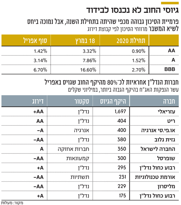 מסיכום של S&P מעלות עולה כי היקף הגיוסים בשוק החוב הקונצרני צפוי לעמוד החודש על 4.9 מיליארד שקל - 80% מתוכו גייסו חברות הנדל"ן בהובלת עזריאלי. מנכ"לית מעלות: "לאחר השיא במרווחי הסיכון ב־18 במרץ חלה בהם ירידה יחסית"