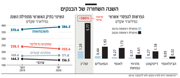 צלילה לנתונים חושפת כמה התפתחויות דרמטיות מהחודשים שחלפו. ראשית, בולטת הצניחה באשראי הצרכני, שהיה עד לפני כמה שנים מנוע צמיחה מרכזי במרבית הבנקים. תיק האשראי למשקי בית התכווץ ב־5.5%, ירידה של 8 מיליארד שקל. גם הביקוש להלוואות ירד בעקבות הסגר והמיתון, אך גם הבנקים הידקו במהרה את מדיניות האשראי שלהם בעקבות המשבר, ולא ממהרים לאשר הלוואות. מנגד, בתחום המשכנתאות שנחשב לבעל רמת סיכון נמוכה יחסית, נראה כי לא שמעו על המשבר: היקף המשכנתאות זינק ב־16 מיליארד שקל במחצית הראשונה של השנה.