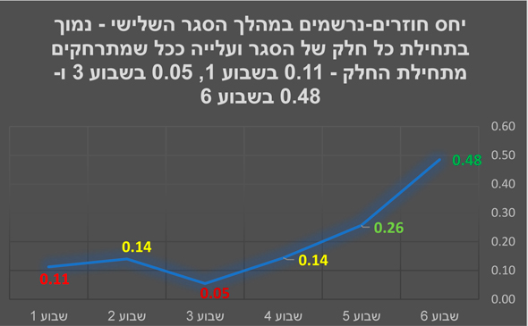 בשבוע שעבר הוכפל קצב החזרה לעבודה, מה שמעיד על כך שחלקים גדולים במשק החלו לחזור לפעילות, למרות מגבלות הסגר. נרשם יחס חזרה לעבודה כללי במשק של 0.5 (חוזר אחד על כל שני מובטלים חדשים). זאת לעומת 0.05 בשבוע השלישי, שהוא השבוע הראשון אחרי הידוק הסגר ו-0.25 בשבוע החמישי.