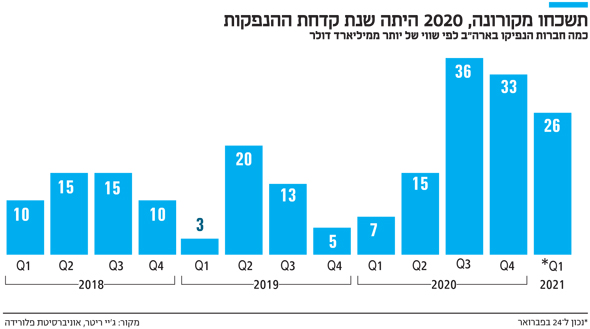 מספר החברות שהונפק בשנה שעברה בוול סטריט היה הגדול ביותר מאז 2000, אבל אלה לא רק המספרים האבסולטיים של חברות שמזהות את ההזדמנות להפוך לציבוריות - אלא גם רמות השווי. מספר החברות שהונפקו לפי שווי של יותר ממיליארד דולר שבר שיא ברבעון האחרון של 2020, ולפי הקצב הנוכחי נראה כי השיא עומד להישבר שוב. 33 חברות כאלה הונפקו ברבעון הקודם ומתחילת השנה כבר הושלמו 26 הנפקות ברמות השווי הגבוהות האלה - לעומת ממוצע רב־שנתי של כ־20 חברות. כל זה, כאשר לחלק ניכר מהחברות אין רווחים ולעתים אפילו לא הכנסות.