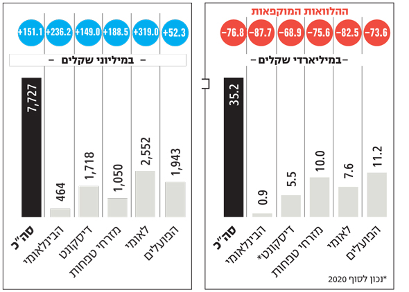 מצד שני יש לזכור כי המדינה עדיין מנשימה רבים מאותם עסקים באמצעות מענקים והקלות אחרות. מבחינת אשראי, רוב ההלוואות שנתנו הבנקים אשתקד למגזר זה היו באמצעות הקרן בערבות מדינה שהוקמה בעקבות המשבר. בשורה התחתונה היקף ההלוואות למגזר זה רשם צמיחה קלה של 2%. מבין הבנקים בולט מזרחי טפחות שהיה פעיל מאוד בקרן, והיקף האשראי שלו בתחום זה זינק ב־16% אשתקד. מנגד, בלאומי ודיסקונט נרשמה ירידה בתיק ההלוואות במגזר זה ב־2020.