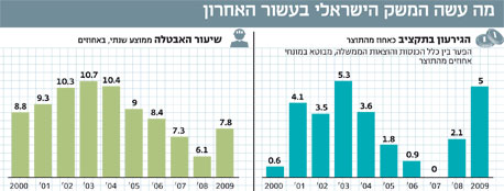לפני שבוחנים את מסלול רכבת ההרים שלאורכו נע המשק בעשר השנים האחרונות, צריך לחזור ולהזכיר בקצרה את השתלשלות האירועים. העשור הראשון של המילניום השלישי נפתח בסערה בצמיחה של 9% שהחזיקה מעמד שנה אחת בלבד. כבר בסוף אותה שנה מוצלחת התחיל המשק לשנות כיוון וגלש למיתון הארוך בתולדותיו, ששב והפך לתקופת גאות ארוכה במיוחד שנמשכה 62 חודשים רצופים. לקראת סוף השנה שעברה התהפך הגלגל עוד פעם ושוב גלש למיתון, הפעם קצר הרבה יותר, שמסתיים ככל הנראה ממש בחודשים האחרונים.