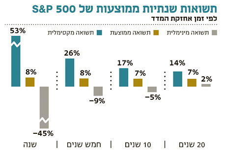 השורה התחתונה: ניתוח התנהגות השוק בארה"ב מאז מלחמת העולם השנייה מראה כי בהשקעה לטווח ארוך, הסיכון יורד, אך התשואה האבסולוטית נותרת גבוהה מזו שמניב אפיק האג"ח הממשלתי.