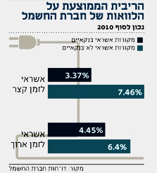 (בישראל ובחו"ל) לטווח קצר של חברת החשמל עמד על כ־4.4 מיליארד שקל, וההתחייבויות ארוכות הטווח לבנקים (בישראל ובחו"ל) עמדו על כ־8.2 מיליארד שקל. שיעור הריבית הממוצע על אשראי בנקאי לזמן קצר של חברת החשמל הוא 3.37%, ושיעור הריבית הממוצע על אשראי בנקאי לטווח ארוך עומד על 4.45%.