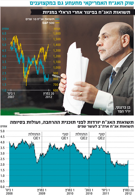 שוק האג"ח העדיף להתעלם, ושוב החל הוויכוח שכבר מזמן הפך לקלישאה - מי צודק, שוק המניות או שוק האג"ח? בשבוע האחרון נראה כי שוק האג"ח מגיב לראלי בשווקים ואינו מצליח עוד להתעלם מהאופטימיות שאחזה במשקיעים. נתונים חזקים משוק העבודה האמריקאי, שהצליח לייצר מעל 200 אלף משרות בשלושה חודשים, והודעת ריבית של הבנק הפדרלי בעלת טון אופטימי וללא כל איתות על אפשרות עתידית ל־QE3, סיפקו רוח גבית לתשואות, שעלו כבר לרמה של 2.35% - ושיקפו ירידת מחיר של 3% בתוך שבוע ימים.