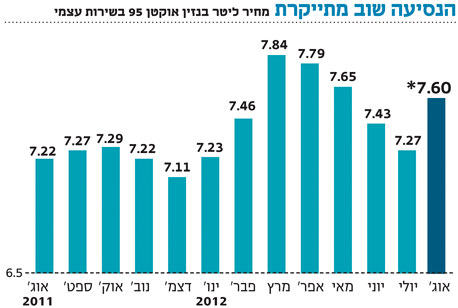 במשק האנרגיה מעריכים שעליית שער הדולר והתייקרות הנפט יביאו את מחירו של ליטר בנזין אוקטן 95 באוגוסט לכ-7.60 שקלים לליטר בשירות עצמי. בחודש יולי פגה הנחת המס בגובה 15 אגורות לליטר בנזין שעליה הכריז ראש הממשלה בפברואר