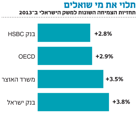צריך להתעכב על עניין נוסף - בחודש האחרון פורסמו ארבע תחזיות צמיחה מעודכנות למשק הישראלי ב־2013 מטעם ארבע גופים שונים, ואף אחת מהתחזיות אינה זהה. התחזיות של ארגון ה־OECD ושל בנק HSBC צופות צמיחה של פחות מ־3%, ואילו התחזיות של משרד האוצר ושל בנק ישראל אופטימיות יותר ומעריכות צמיחה של יותר מ־3%.