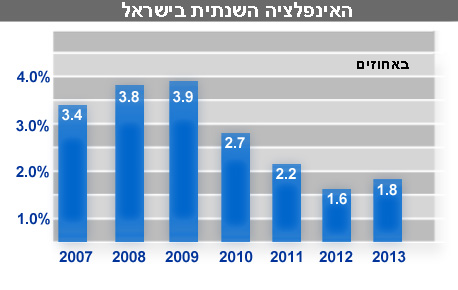 האינפלציה השנתית ממשיכה לנוע סביב מרכז תחום היעד השנתי שקבעה הממשלה (3%-1%). מדד חודש דצמבר שפרסמה הערב (ד') הלמ"ס עלה כצפוי בשיעור מתון של 0.1%, וכתוצאה מכך הסתכמה האינפלציה בכל שנת 2013 ב- 1.8%, בהמשך לאינפלציה של 1.6% בשנת 2012, ושל 2.2% שנרשמה בשנת 2011. בחמש השנים האחרונות (דצמבר 2013 לעומת דצמבר 2008), נרשמה במדד המחירים עלייה מצטברת של 12.8%.