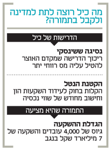 כיל מציעה למדינה להשקיע 7 מיליארד שקל בנגב ולהעסיק עוד 4,000 עובדים חדשים במידה וירוככו המלצות ששינסקי 2. עוד דורשת כיל הקלות בחוק לעידוד השקעות הון, ובנוסף גם שהמדינה תדון איתה על שאלת חישוב שווי נכסיה ביום סיום הזיכיון שלה.