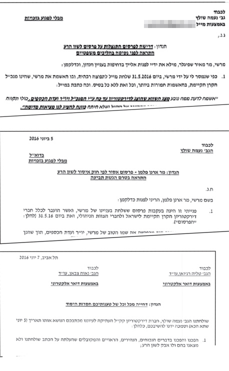 בתחילת השבוע נחתו על שולחנה של שולץ שני מכתבים מעורכי דין ובהם התראות לפני נקיטת הליכים משפטיים - האחד מצד שפיגלר והשני מטעמו של פלמן. את שפיגלר מייצג משרד עו״ד גיא יפרח ואילו את פלמן מייצגת עו״ד טליה רג׳ואן. בשני המקרים יוצאים השניים נגד שולץ שהשתמשה בביטויים ״מציאות מדומה״ ו״מצג שווא״, טוענים כי מדובר בעבירה על חוק לשון הרע ודורשים את התנצלותה הפומבית בתוך 48 שעות מרגע קבלת המכתב. שפיגלר אף הוסיף כי באם לא תעשה כן יגיש נגדה תלונה במשטרה.