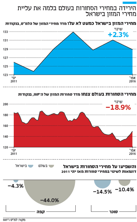 לפי מדד ה־IMF של קרן המטבע הבינלאומית (הכולל את מדדי הסחורות הבסיסיים כגון דגנים, בשר, פירות ועוד), מאז יוני 2011 ירדו מחירי הסחורות בעולם ב־18.9%. לירידה הזאת תרמו בין היתר הירידה הכללית במחירי הסחורות בעולם וירידת מחירי האנרגיה. אמנם מדד הסחורות העולמי לא חופף לחלוטין למדד מחירי המזון בישראל, גם משום שבמדד העולמי כלולות סחורות שמשמשות פעמים רבות חומר גלם וגם כי אי אפשר להשוות את סל הצריכה של הסיני הממוצע לזה של הישראלי הממוצע, אבל בשורה התחתונה מחירי המזון ירדו גם בפריז ובבואנוס איירס. כלומר, כשמחירים בעולם ישובו לעלות — וזה רק עניין של זמן — גם המחירים בישראל ישובו לעלות. אלא אם יבוצעו רפורמות גדולות ועמוקות במבנה של שוק המזון הישראלי.