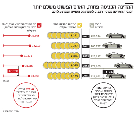 הכנסות המדינה ממסים על רכבים וחלפים לרכבים ירדו בשנת 2015 בכ־10% - כך עולה מדו"ח שפרסמה אתמול רשות המסים. בסך הכל, המדינה רשמה באותה שנה הכנסות של 9.238 מיליארד שקל ממיסוי על רכב ועל חלפים, זאת לעומת 10.275 מיליארד שקל בשנת 2014. הסיבה לכך, מודגש בדו"ח של רשות המסים, היא העובדה ששנת 2015 היתה שנה בה נכנס לתוקף מתווה מיסוי ירוק חדש ומחמיר יותר, שגרם ליבואני הרכב לשחרר ממכס רכבים רבים בשלהי 2014 וזאת כדי לשלם את מס הקנייה שלפני העדכון.
