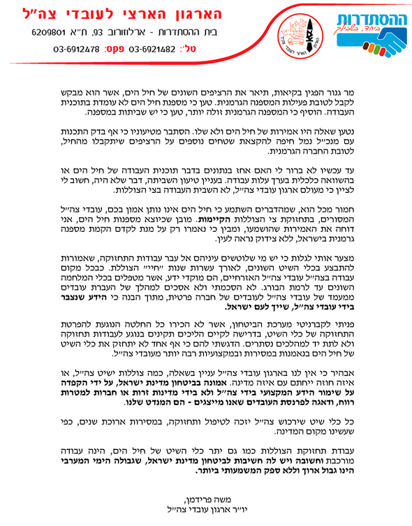 את מכתבו מסיים פרידמן בפנייה לעובדים: "האזרחים הם מוקדי ידע, אשר מטפלים בכלי מלחמה שונים עד לרמת הבורג. לא הסכמתי ולא אסכים למהלך של העברת עובדים ממעמד של עובדי צה"ל לעובדים של חברה פרטית, מתוך הבנה כי הידע שנצבר בידי עובדי צה"ל שייך לעם ישראל. אמונה בביטחון מדינת ישראל, על ידי הקפדה על שימור הידע המקצועי בידי צה"ל ולא בידי מדינות זרות או חברות למטרות רווח, ודאגה לפרנסת העובדים שאנו מייצגים - הן המנדט שלנו".