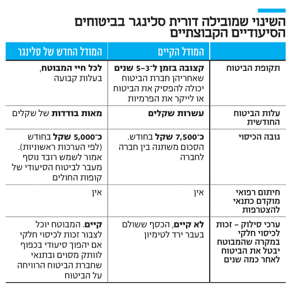 קשה גם שלא לדמיין מה יקרה בשנה הבאה. סלינגר תציג את המודל שלה שיוכיח שכסף לא נופל מהעצים וכדי לקבל כיסוי ארוך טווח צריך לשלם יותר, הרבה יותר. במקום עשרות השקלים בחודש שמשלמים היום המבוטחים, הם יצטרכו לשלם מאות שקלים בחודש כדי להבטיח כיסוי לכל החיים.