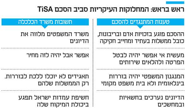 הסכם הסחר TiSA שאמור להסדיר את הסחר בשירותים בין 50 מדינות מפותחות, בהן ישראל, ולהעניק תנאי תחרות שווים לתאגידים זרים, מעורר התנגדות בכנסת. מדובר בהסכם שיגביל מאוד את הרגולציה המגנה על הכלכלה המקומית ואת היכולת לבטל הפרטה.