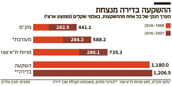 העלייה השנתית הממוצעת במחירי הדיור עמדה בשנים הללו על שיעור שנתי ממוצע של 8.5% לעומת תשואה שנתית ממוצעת, הן של מדד ת"א־100 והן של המק"מ, בשיעור של כ־2%. כך, בממוצע הארצי, מי שרכש דירה באותן השנים קיבל ערך שגדול פי 4.2 מהערך שהיה מקבל לו השקיע בהשקעה פיננסית. בתל אביב הערך שקיבל המשקיע היה גדול פי ארבעה מהערך שהיה מקבל מהשקעה פיננסית, בירושלים פי 3.2, ובחיפה פי 3.8.