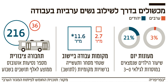 עוד נתון שממחיש את הצפיפות התעסוקתית במגזר הערבי ניתן למצוא בתוכנית הרב־שנתית לפיתוח כלכלי במגזר, שממנה עולה כי היקף שטחי התעסוקה לנפש במגזר הערבי עומד על 2.7 מ"ר לנפש, לעומת 11.6 מ"ר ביישובי הפריפריה היהודיים.