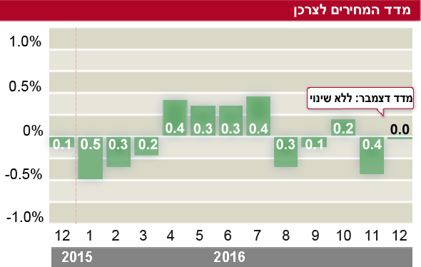 מדד דצמבר נותר ללא שינוי ברמה של 0%. הסעיפים העיקריים בהם נרשמו ירידות זה פירות עם 3.6%, תרבות ובידור - 1.8% ובעליות בלטו ירקות טריים עם 4.6%