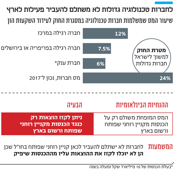 במטרה למשוך לארץ חברות טכנולוגיה גדולות קבע חוק עידוד השקעות הון החדש כי חברות הייטק שעיקר הכנסותיהן הן מקניין רוחני ייהנו משיעור מס של בין 6% ל־12%; אלא שהחוק גם קובע שאותן חברות יוכלו לקזז את ההוצאות שלהן על הקניין הרוחני מחו"ל רק מההכנסות המשויכות לארץ, מה שהופך את המהלך ללא כדאי עבורן