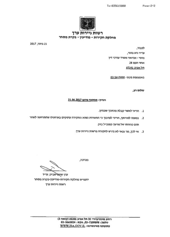 מכתב ששלחה רשות ניירות ערך בעניין אבי גבאי: