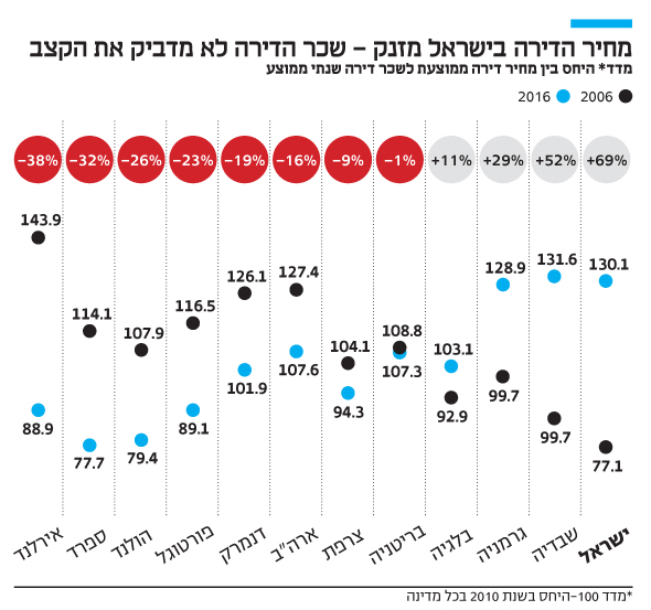 לפי הגרף, ישראל ממוקמת נכון לסוף 2016, במקום השלישי בארגון אחרי ניו זילנד ושוודיה, כלמור היחס בין מחיר הדירות למחרי השכירות בארץ גבוה גם בהשוואה בינלאומית. זאת בזמן שב־2006, כעשור לאחור, היחס בישראל היה הנמוך ביתר בארגון. משמעות הדבר היא כי שיעור הזינוק של יחס מחירי קנייה־שכירות, מדד שנחשב טוב ליווצרות בועות, היה הגבוה ביותר בקרב מדינות המערביות והגיע לכ־69% תוך עשור.
