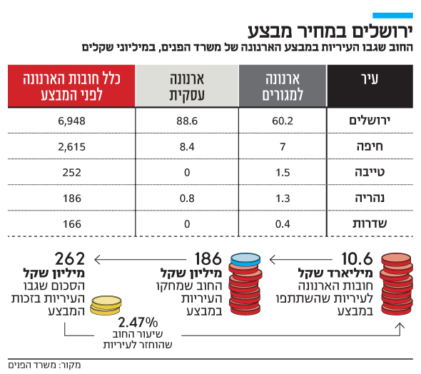 מבצע גביית הארנונה שהשיק משרד הפנים בשנה שעברה הצליח מעבר לציפיות. לפי נתונים שהגיעו לידי "כלכליסט", מאז חודש אפריל החזירו תושבים ובתי עסק חובות בהיקף של 260 מיליון שקל לרשויות שהשתתפו במבצע ‑ יותר ממחציתם בעיריית ירושלים.