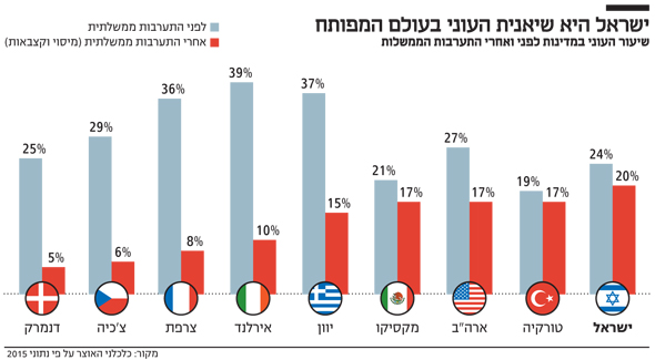 נתון נוסף שמחזק את "הקמצנות" של מדיניות הרווחה הישראלית, הוא הפער הזעיר בין שיעור העוני לפי הכנסה ברוטו לבין הכנסה נטו. רק 5 נקודות אחוז. מדיניותה של הממשלה מקטינה את העוני מ־22.7% ל־17.7%. כדי לסבר את האוזן - המדיניות באירלנד ובצרפת חותכות את העוני בכמעט 30 נקודות אחוז. יותר מתחולת העוני בישראל כולה.
