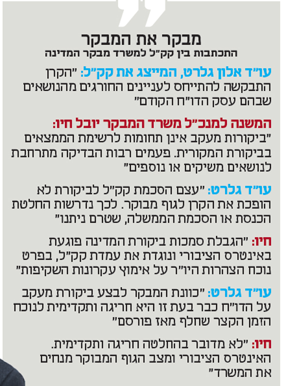 בתגובה לכך, כתב חיו לגלרט ביום ראשון השבוע: "נמשיך ונעסוק בכל הנושאים הרלבנטיים לביקורת מעקב זו". חיו ציין כי דבריו נכתבו על דעת המבקר שפירא. "ביקורות מעקב אינן תחומות בהכרח לרשימת הממצאים שהועלו בביקורת המקורית", הוסיף חיו. לדבריו, לעתים נדרש המבקר להרחיב בדיקה לנושאים נוספים - ואז הופכת בדיקת מעקב למעקב מורחב.