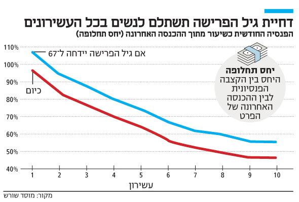 בגזרה אחרת, החוקרים מתריעים על הפגיעה הדרמטית בגמלאות הנשים בשל העיכוב בהעלאת גיל הפרישה, כתוצאה ממחלוקת בין ועדת הכספים לאוצר.