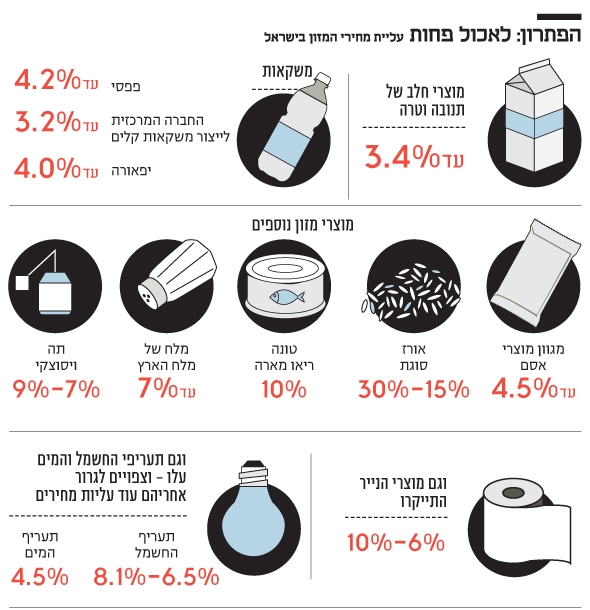 גל ההתייקרויות שפוקד את ישראל מתפשט לתחומים רחבים, אבל הפגיעה הכואבת ביותר ניכרת בסל הקניות בסופר. בחודשים האחרונים נרשמו עליות מחירים בשורה ארוכה של מצרכי מזון, ובהם מוצרי חלב, אורז ומשקאות. רק השבוע הודיעה אסם כי תעלה את מחירי שליש ממוצריה בשיעור של עד 4.5%, כשהיא מצטרפת לחוגלה קימברלי, סנו ושניב, שהודיעו עוד בחודש יוני על ייקור של 6% במוצרי הנייר שלהן, ולתנובה וטרה שייקרו את מוצרי החלב שאינם בפיקוח בכ־3.4%. על העגלה קפצו עוד חברות גדולות וקטנות מקוקה קולה, טמפו ויפאורה ועד סוגת, מלח הארץ, ויסוצקי וטונה ריו מארה של שסטוביץ.