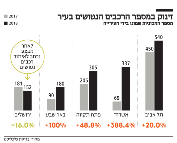 לפי הנתונים, מספר הרכבים הנטושים נמצא במגמת עלייה ברחבי הארץ. כך בשנה שעברה נגררו בתל אביב כ־540 רכבים, כלומר כאלה שהפכו למטרד, לעומת כ־450 רכבים ב־2017. באשדוד נרשם הזינוק הגבוה ביותר בין הערים: בשנה שעברה נגררו בה 337 גרוטאות של רכבים, עלייה חדה מול 69 רכבים בשנת 2017 – זינוק של 388%.