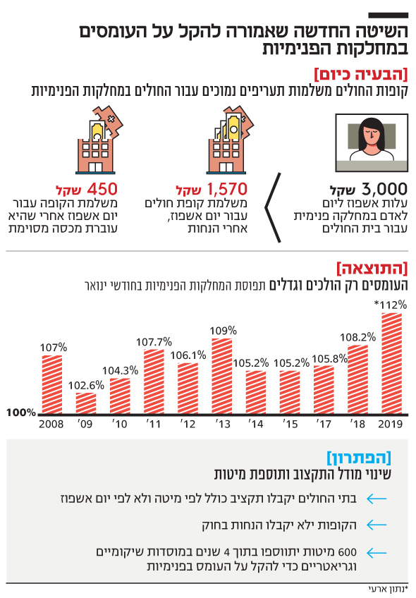 עם זאת, אם קופת החולים עברה את המכסה שנקבעה בינה לבין בית החולים, אז קופת החולים משלמת רק 450 שקל, כלומר חמישית מהסכום. מנגד, עלות האשפוז לבית החולים ליום היא קבועה ונעה בין 2,000 ל־3,000 שקל. "זו הסיבה שלקופות החולים אין תמריץ כלכלי לשלוח את אותם מאושפזים לאשפוז המשכי והן פחות רואות את מחיר העומס, ועדיף להן להשאיר אותם בפנימיות. מי שנפגע זה המטופל. זה שיווי משקל מעוות", מסביר בכיר במערכת.