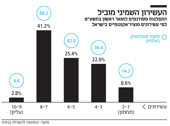 במועצה להשכלה גבוהה מדגישים את העובדה שמדובר בתוספת של 8,000 סטודנטים, וב־2019 יותר מ־50 אלף סטודנטים לתואר ראשון הגיעו מיישובים בארבעת העשירונים הנמוכים. אבל בסך הכל עדיין שני שלישים (67%) מהסטודנטים מגיעים מיישובים בששת העשירונים העליונים, וקרוב שליש (30%) מגיעים מארבעת העשירונים התחתונים. הכתובת של אחוזים בודדים מהסטודנטים לא ידועה, ולכן לא נכללו בנתונים. סביר שרוב הסטודנטים מיישובים חלשים למדו במכללות.