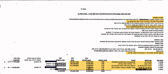 חלק מתשלומי השוחד יועדו להשפיע על עובדי ציבור, למשל במשרד התחבורה או ברשות הכבישים, לאשר לשיכון ובינוי זכייה במכרזים או הקצאה של פרויקטים ללא מכרז. במסך כאן, שנתפס במחשבו של אחד החשודים, מתואר פרויקט כזה שהכניס לחברה כ־81 מיליון שקל. המסמך מפרט על מה משלמים, למי, כמה ובהמשכו יש גם טבלת מעקב מתי שולמה כל מנה.