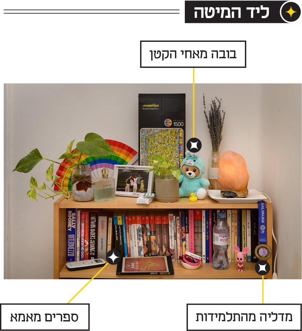 "כוננית ועליה כל הדברים שאני צריכה: כדורים נוגדי דיכאון; תמונה של חברים מהשירות הלאומי; צמידים שחילקנו לילדים. ויש הרבה דברים שהבאתי מהבית: בובה שקניתי לאחי, והוא נתן לי אותה כשהם עברו לפריז; צמחים מאמא, שהיתה מגדלת כל מיני ייחורים; פאזל, כי אבא שלי והאחים אהבו לעשות; מדליה שקיבלתי מבנות קבוצת הכדורסל של בית הספר כשהן זכו בליגה — הייתי האוהדת מספר 1 שלהן, מלווה אותן באוטובוס, מכינה להן כל מיני פינוקים לדרך. יש גם ספרים מהבית — גדלתי על ספרות מצוינת ובגיל 4 כבר ידעתי לקרוא בעצמי, אבל עדיין אהבתי שהקריאו לי. יש לי קעקועים של דמויות מהספרים שגדלתי עליהם: מאי הקטנה מהמומינים, קורקבן החתול של נורית זרחי, פינדוס החתול מ'עוגת יום ההולדת של פינדוס' של סוון נורדקוויסט. כרגע אני קוראת את 'הר אדוני' של ארי דה לוקה, שאמא נתנה לי".