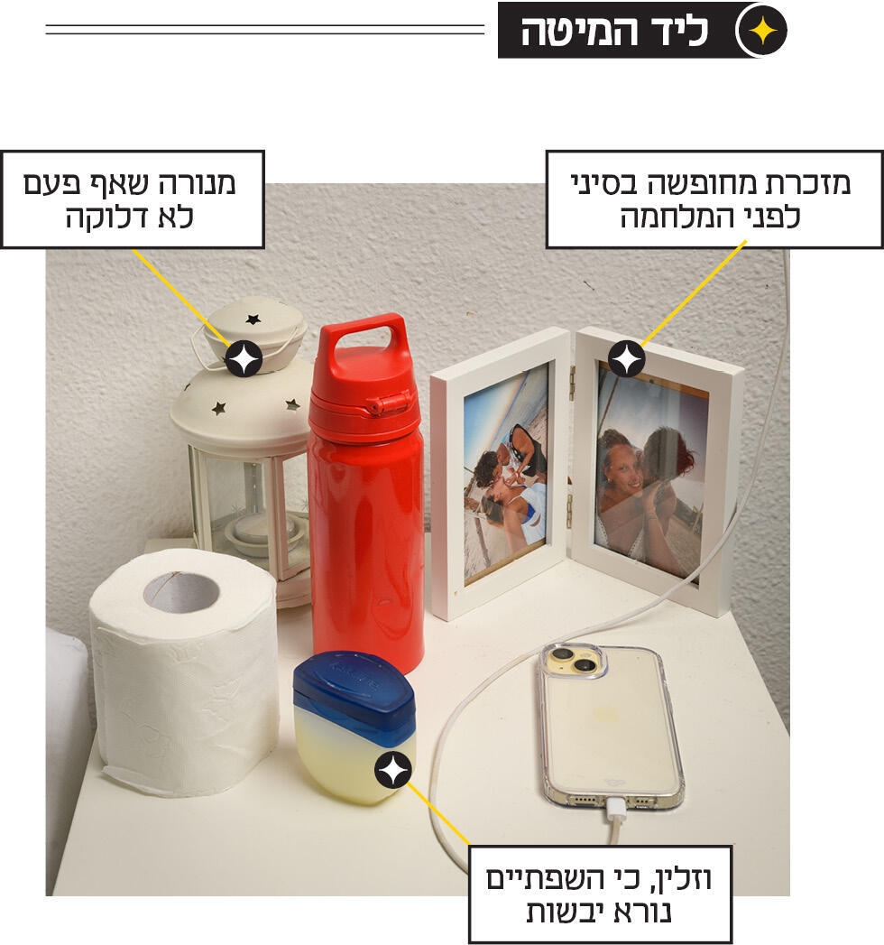 "תמיד בקבוק מים, אני שותה לפני השינה. וזלין, כי השפתיים נורא יבשות. טלפון בטעינה. ותמונה שלי עם בת הזוג שלי בחופשה בסיני, לפני המלחמה. יש גם טישו ומין מנורה לקישוט שאני אף פעם לא מדליק".