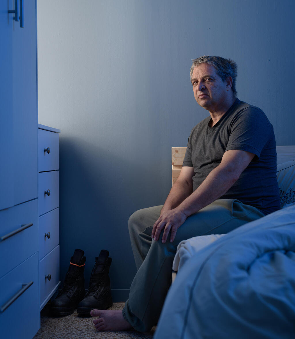 "אני ישן מעולה, אף פעם לא היו לי הפרעות שינה. אבל מאז המלחמה התחילו לי קצת דלקות ברגליים, הייתי במילואים שבעה חודשים, התנוונתי בישיבה ממושכת, וכשחזרתי לעבודה פיזית נוצרו דלקות. מדי פעם הן מפריעות לי לישון. גם בלילות שבהם היו שרפות באזור, מהפצצות של חזבאללה, לא ישנתי כמו שצריך, כי אם יש שרפה אתה חייב לקום ולהגיב מיד, הייתי קם כמה פעמים בלילה. עוד משהו הפריע לשינה שלי במלחמה היה המבטים המוטרדים של כתבי החדשות — כשקרה משהו ועוד לא מפרסמים מה. הייתי מחכה לדיווח, או הולך לישון מוטרד, חולם חלומות רעים ומתעורר בהרגשה איומה, חושש לשמוע מה קרה".