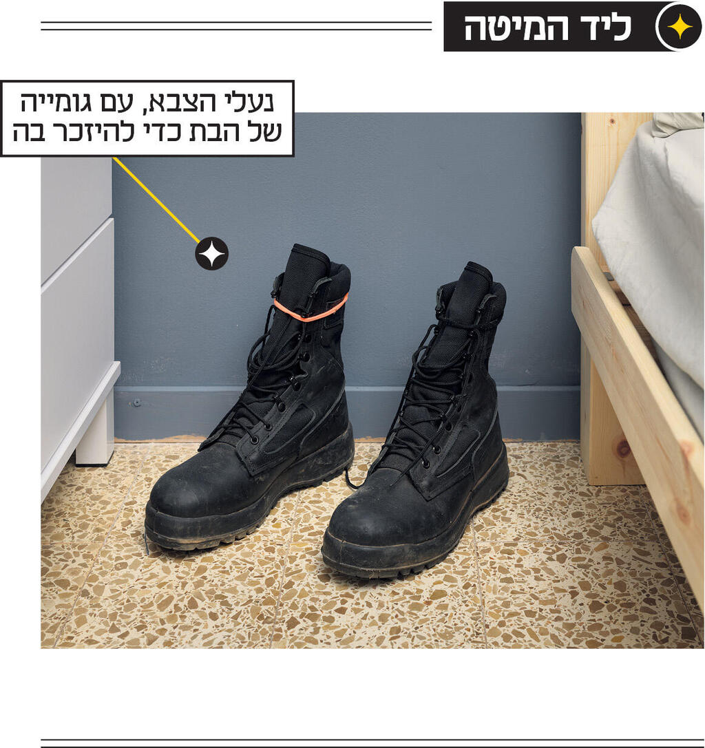 "מתחת למיטה יש נשק, מתחילת המלחמה. זה סוג של אחריות אזרחית חדשה, במיוחד פה בגבול — לתת לתושבים את הביטחון, שלא יהיו קנה או שניים אלא 20 או 30. ויש גם מגפי צבא, כי הייתי כונן של החטיבה בשבועיים האחרונים. על אחת מהן יש גומייה של הבת שלי, כדי להיזכר בה כשאני במילואים".